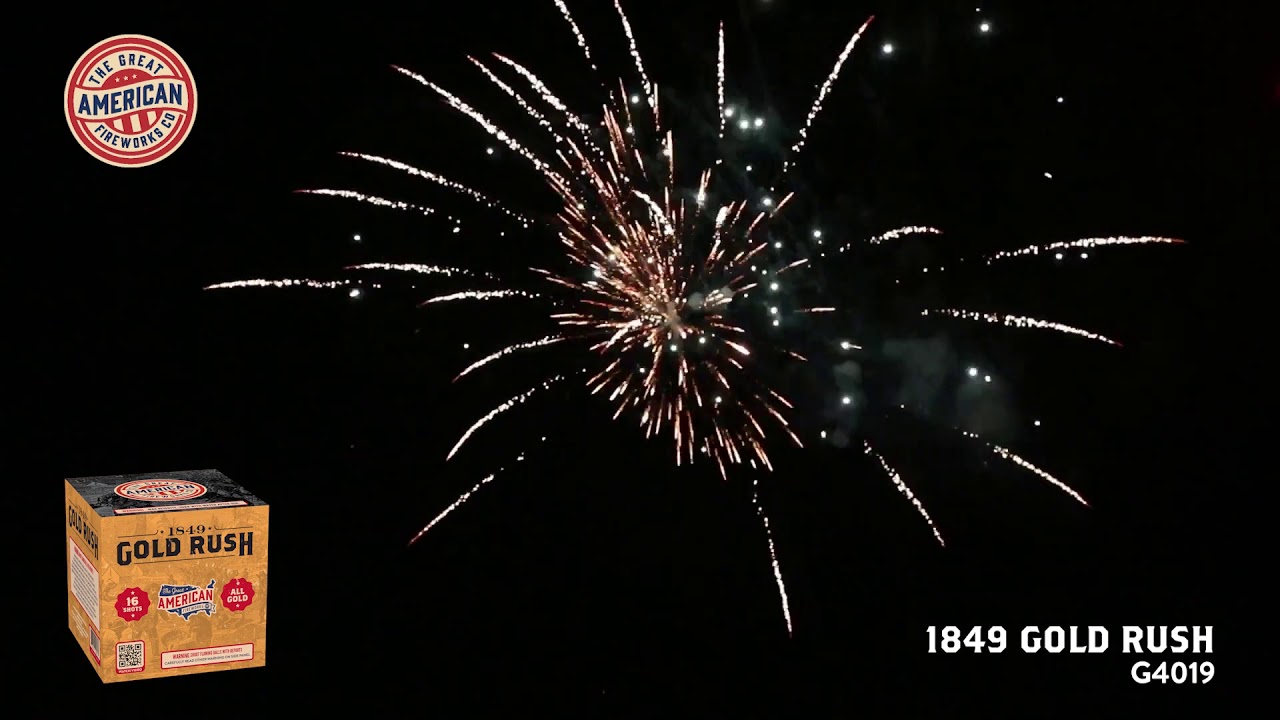 1849 Gold Rush fills the sky with a fantastic, all-gold display! The first 12 shots alternate between gold tails to brocades with strobe ... source , Superior Fireworks